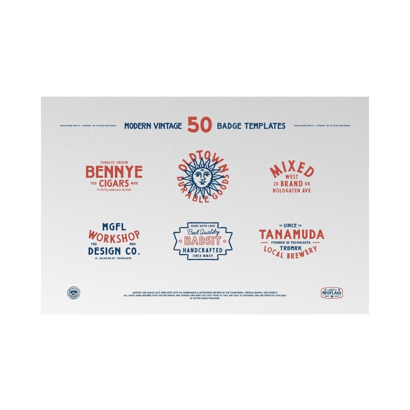 Badfest عبارة عن قوالب شعار شارات مع 50 رسما توضيحيا مرسوما باليد مستوحاة من الرسم والختم التقليديين. تم تصميم جميع الشعارات بأشكال وضربات متجهة ولها مسارات نصية حية بحيث يسهل تخصيصها وقابلة للتطوير تماما في البرامج القائمة على المتجهات.