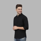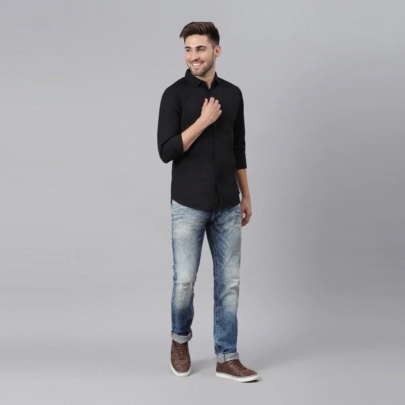 قميص كاجوال أسود صلب، بياقة عريضة، أزرار ضيقة، وحافة منحنية