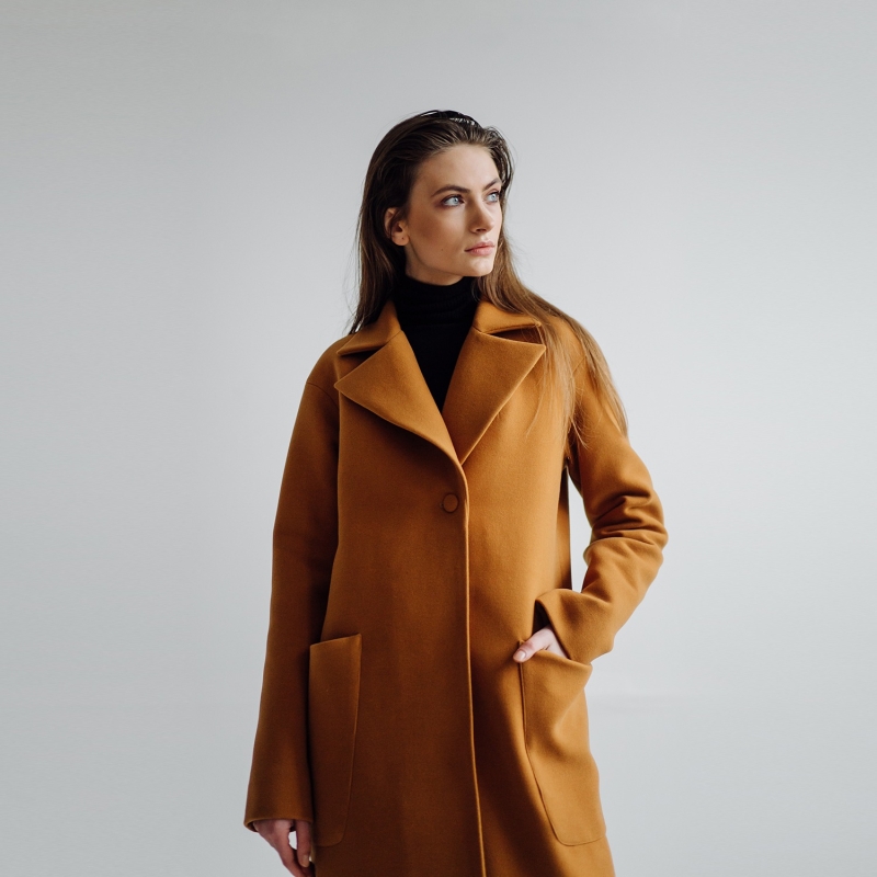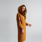 معطف خندق صلب بخط طويل بلون أصفر خردل ، له طية صدر مسننة ، مزدوجة الصدر مع زر للإغلاق ، أكمام طويلة ، جيبان ، بطانة مرفقة