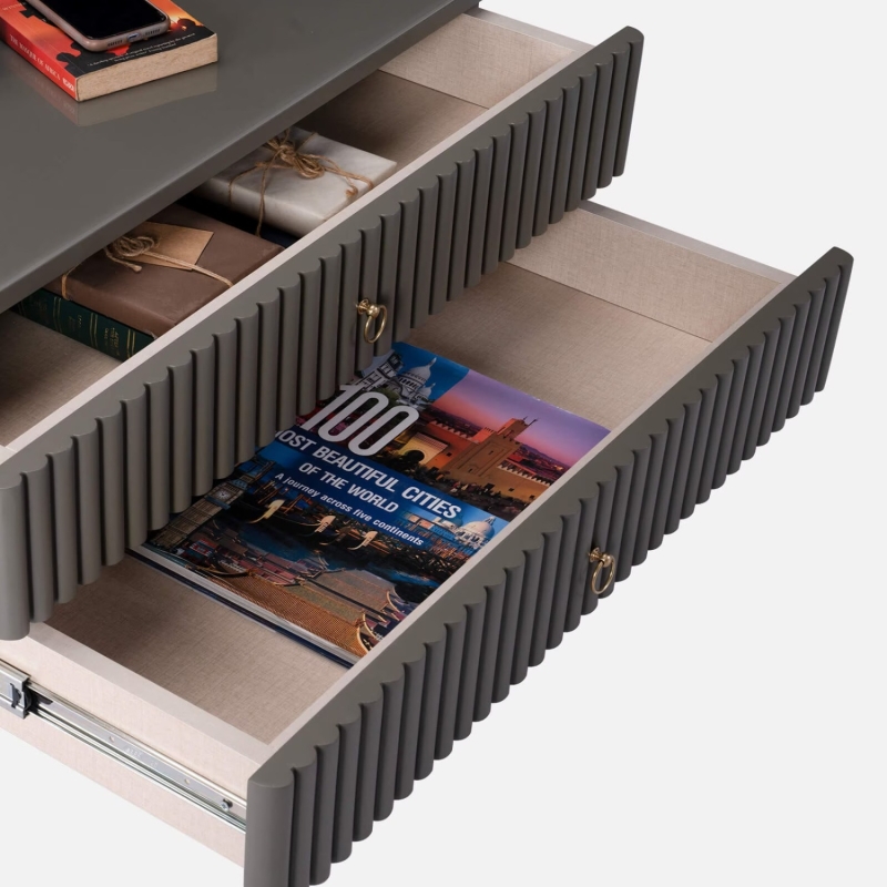 • Two roomy drawers offer ample storage for collectibles and essentials.