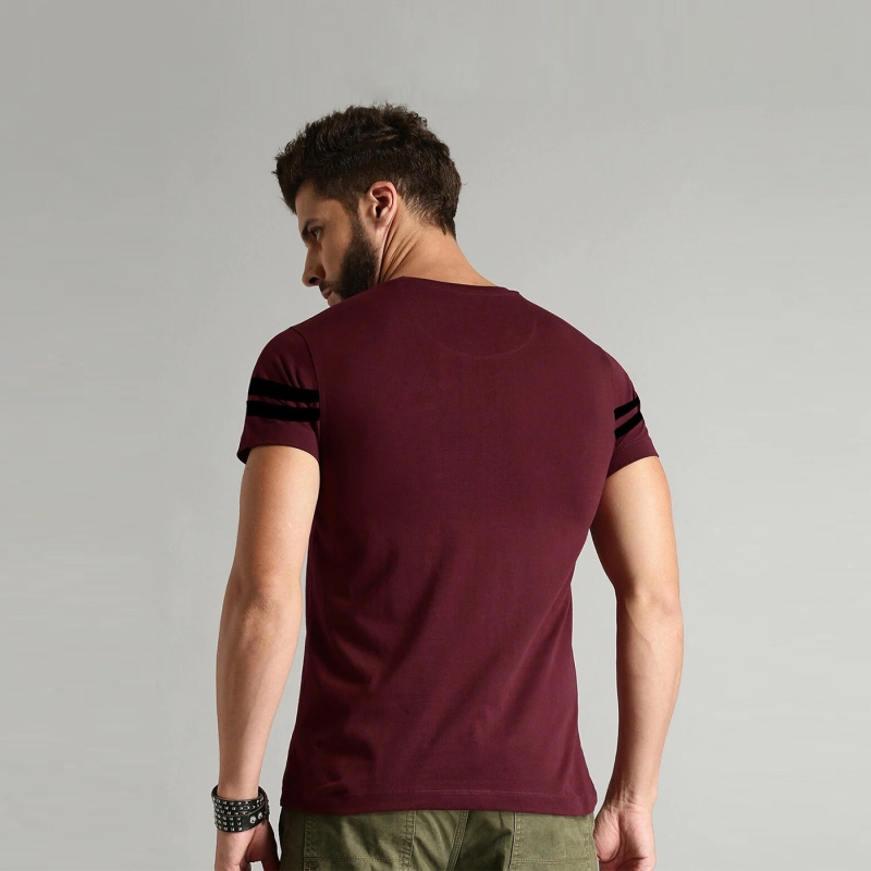 • Maroon solid T-shirt, has a round neck, short sleeves.