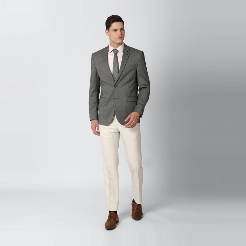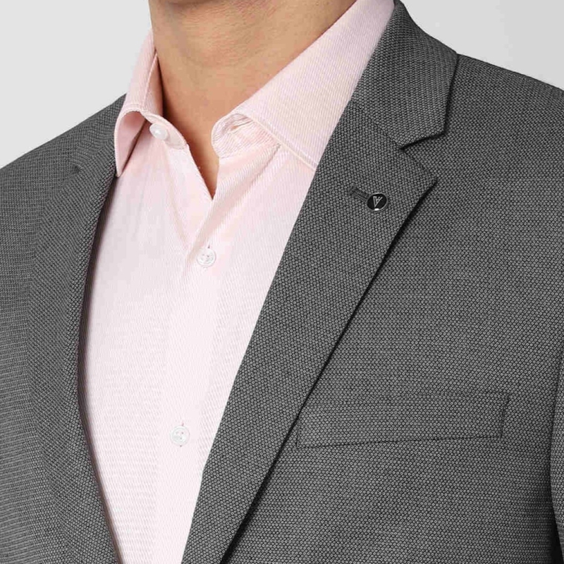 Grey self design slim fit formal blazer, has a notched lapel collar, long sleeves with buttons, single breasted with button closures,2 mock pockets with flaps ,1 pocket on chest and 2 internal pockets, attached lining, double vented back hem.