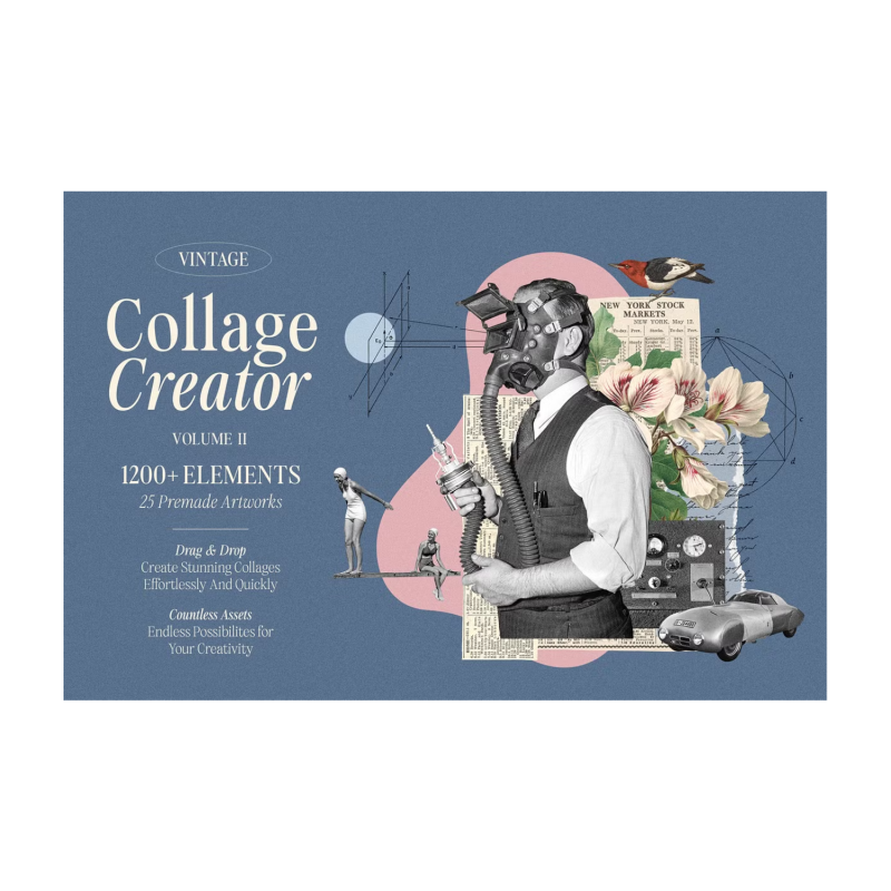 This is the second volume of one of Creative Market’s biggest bestsellers (https://creativemarket.com/GraphicGoods/5916310-Vintage-Collage-Creator-750-Assets). Vintage Collage Creator Vol. 2 is even better, bigger, and more versatile collection than its predecessor. This huge package of 1200+ elements sourced from a variety of old photos, illustrations, art, ephemera, and textures is the ultimate arsenal for every digital collage maker who loves vintage esthetics. As a bonus, you get the 25 premade collage artworks to inspire you and get you started.