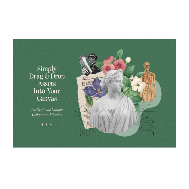 Easily create outstanding collages in minutes. Simply drag & drop elements of your choice out of 1200+ assets included. Endless combinations and possibilities for your creativity.