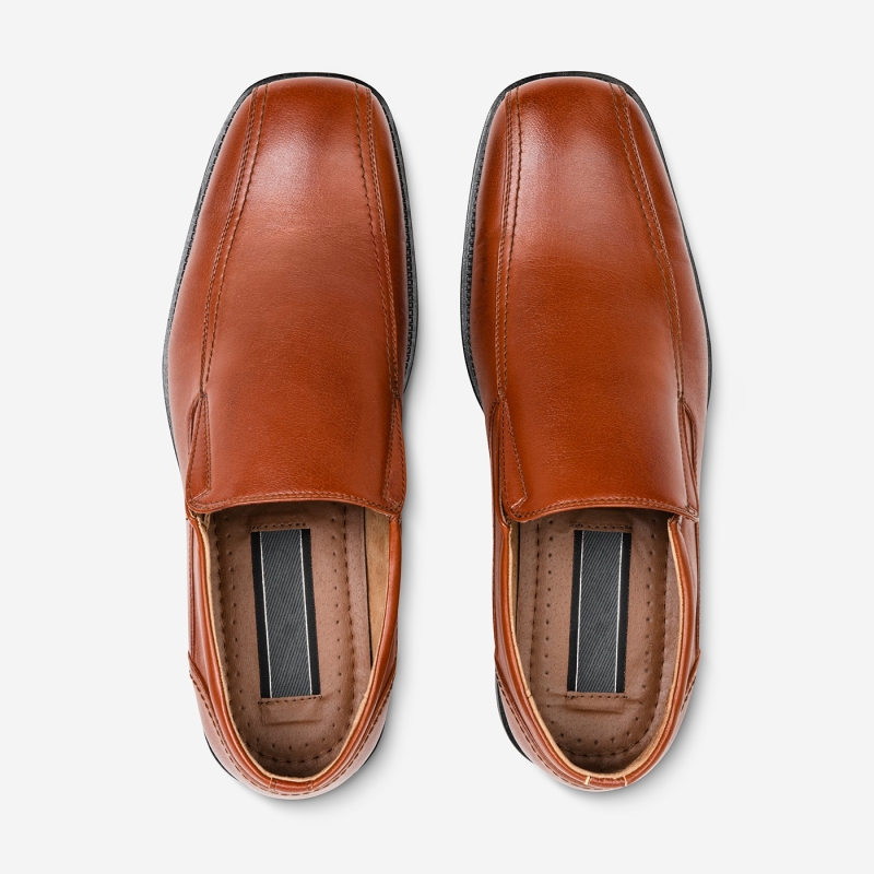 يتميز زوج من الأحذية الرسمية بمقدمة دائرية بمقدمة بنية اللون بتصميم منتظم، مع إغلاق سهل الارتداء.