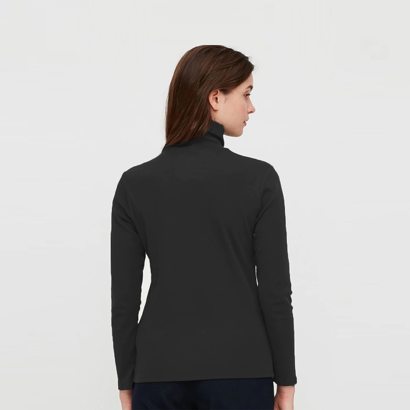 تي شيرت أسود صلب ، له ياقة سلحفاة ، وأكمام طويلة.