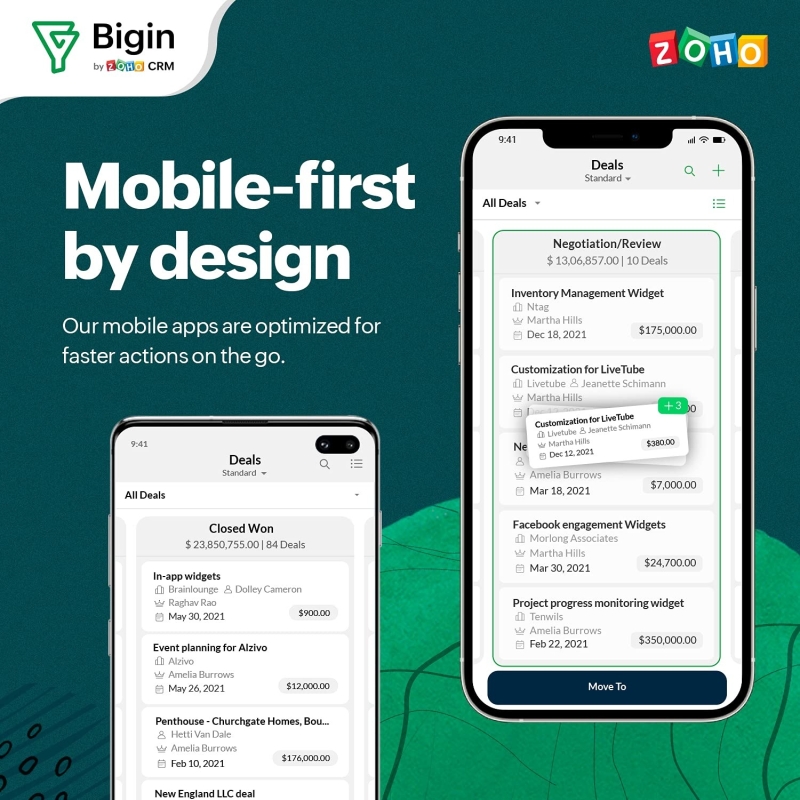 • Focused on providing an excellent user experience, Bigin's highly-rated mobile apps help you manage deals and stay updated on customer information even when on the go